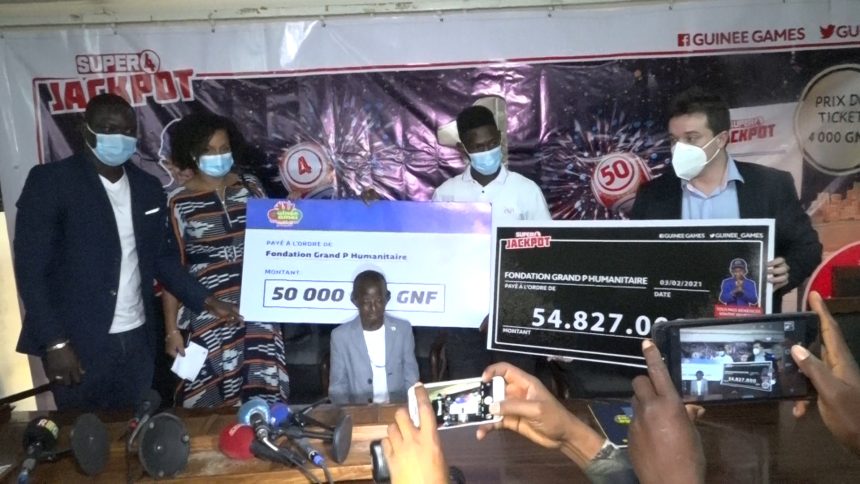 Ce don est divisé en deux tranches. Il s’agit en premier d’un montant de cinquant quatre millions huit cent vingt sept mille francs guinéens , soit le bénéfice du super 4 Jackpot exceptionnel d’un milliard de francs guinéens, proposé chaque année par la société Guinée Games.