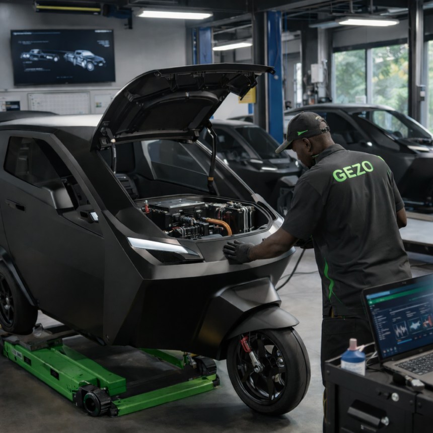 Premier modèle développé par l’entreprise, le GEZO est un tricycle électrique et connecté conçu pour répondre aux réalités de la mobilité urbaine africaine. Fabriqué au sein de l’usine de Cotonou, au Bénin, il affiche une autonomie de 120 km en conditions réelles, grâce à une batterie optimisée garantissant une utilisation fiable au quotidien.